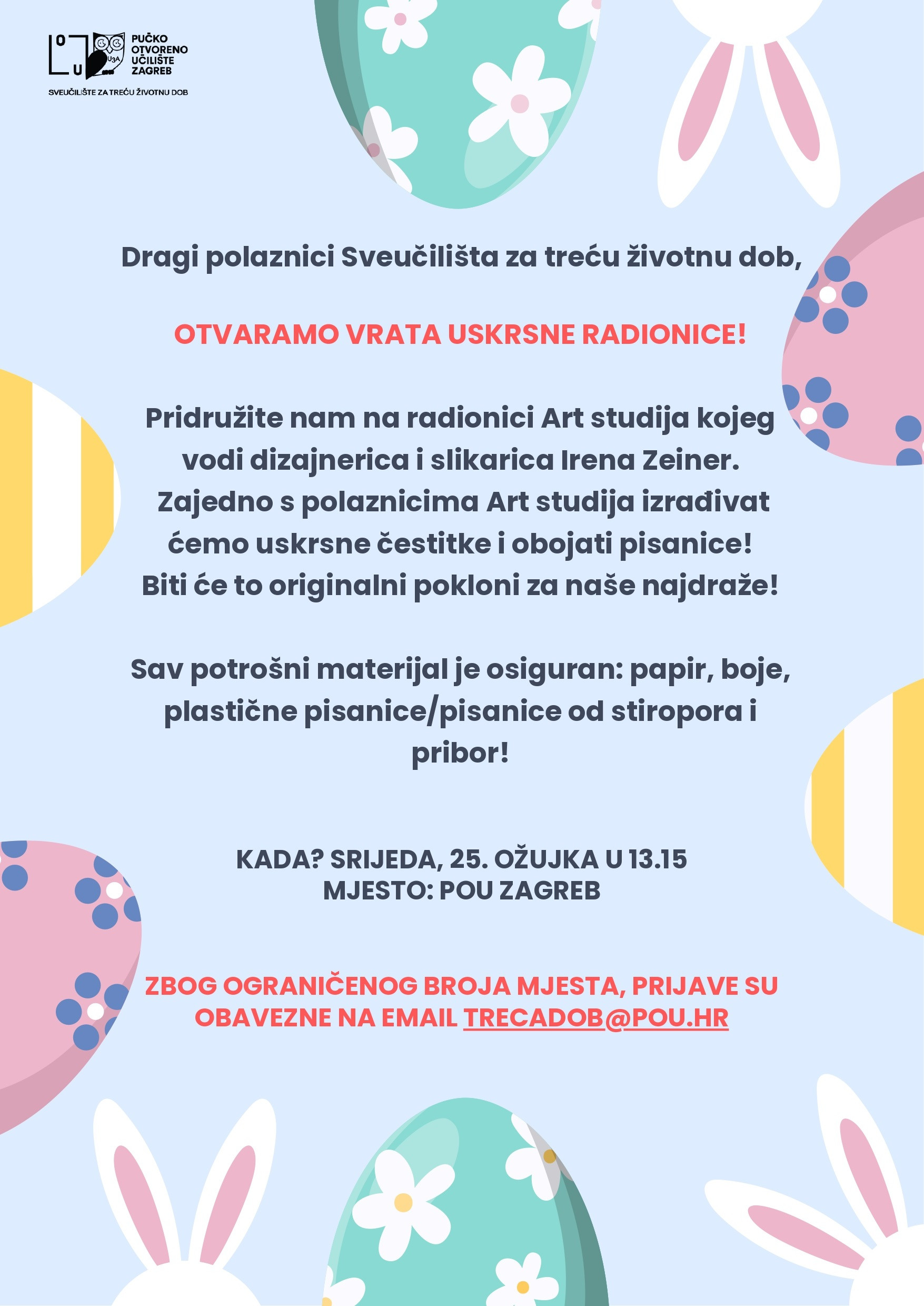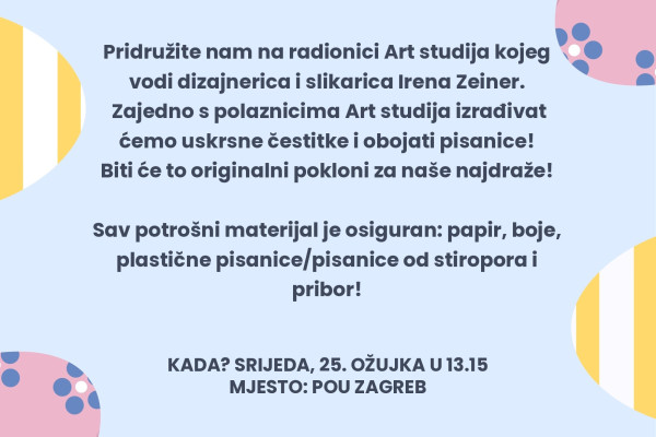 Pridružite nam se na radionici Art studija kojeg vodi dizajnerica i slikarica Irena Zeiner. Zajedno s polaznicima Art studija izrađivat ćemo uskrsne čestitke i bojati pisanice. Bit će to originalni pokloni za naše najdraže!