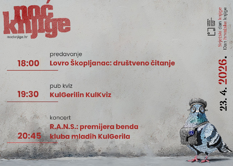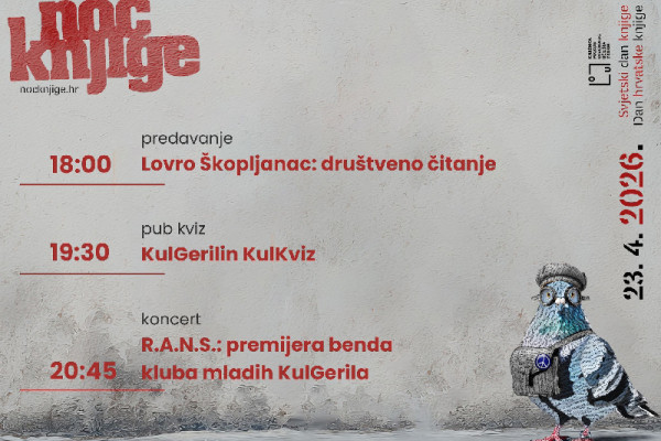 Dragi svi, želite li provesti nekoliko ugodnih, zabavnih i inspirativnih sati s nama? Obećavamo da ćemo nakon Noći knjige svi biti barem mrvicu pametniji, veseliji i bogatiji za još jedno zajedničko iskustvo, jer vas čeka: