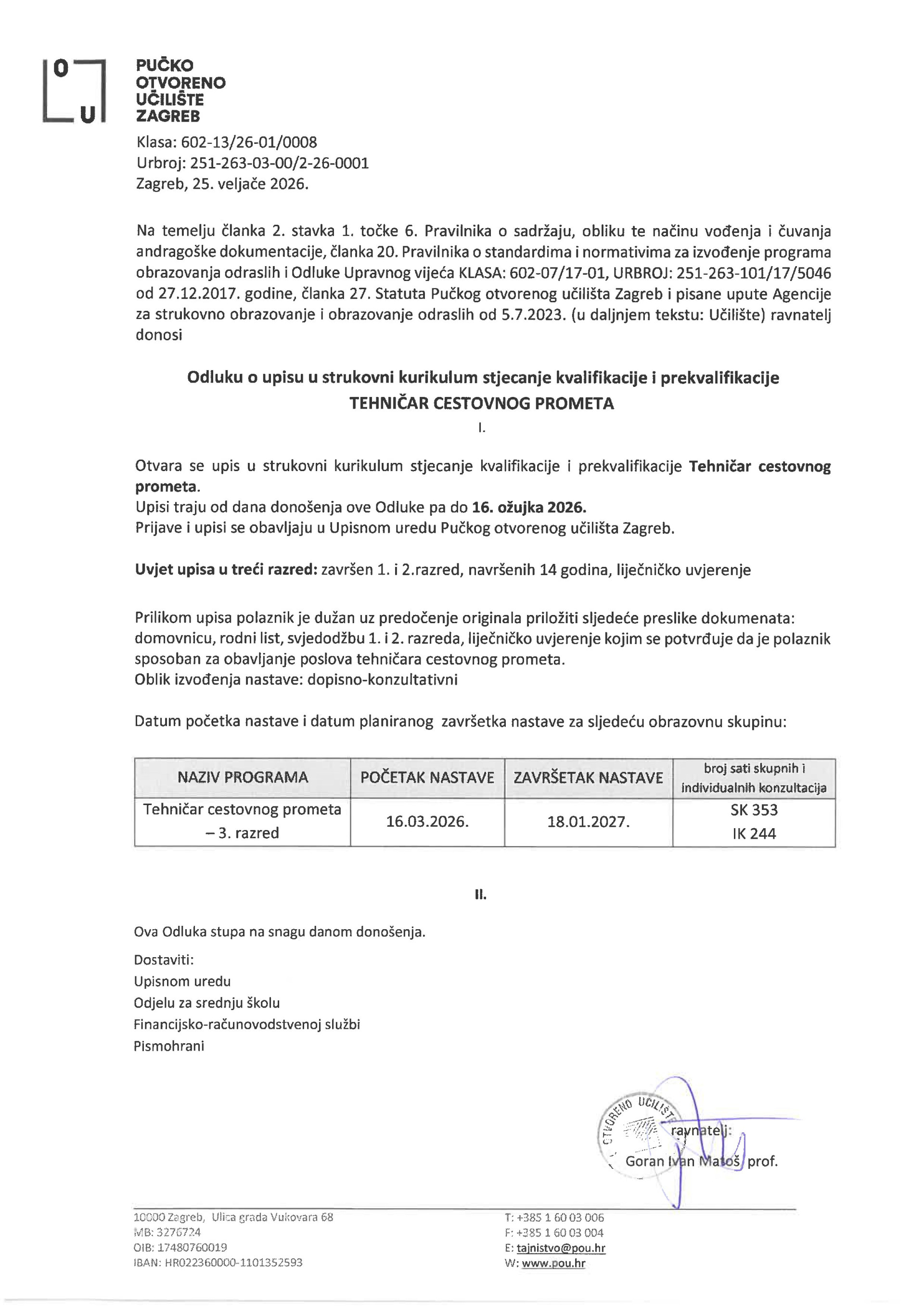 Upisi i informacije: u Upisnom uredu radnim danom od 8 do 17:30.