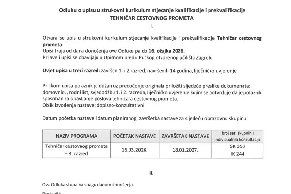 Ako želiš nastaviti ili unaprijediti svoje znanje iz područja organizacije prometa, logistike, prijevoza putnika i tereta, sigurnosti u prometu te rada prometnih sustava, sada je pravi trenutak. Upisujemo 3. razred četverogodišnjeg programa Tehničar cestovnog prometa.