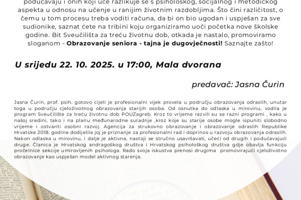 Na ovoj tribini ugostit ćemo Jasnu Čurin, prof. psihologije, prvu voditeljicu našeg Sveučilišta za treću životnu dob koja je zaslužna za njegov nastanak i razvoj.