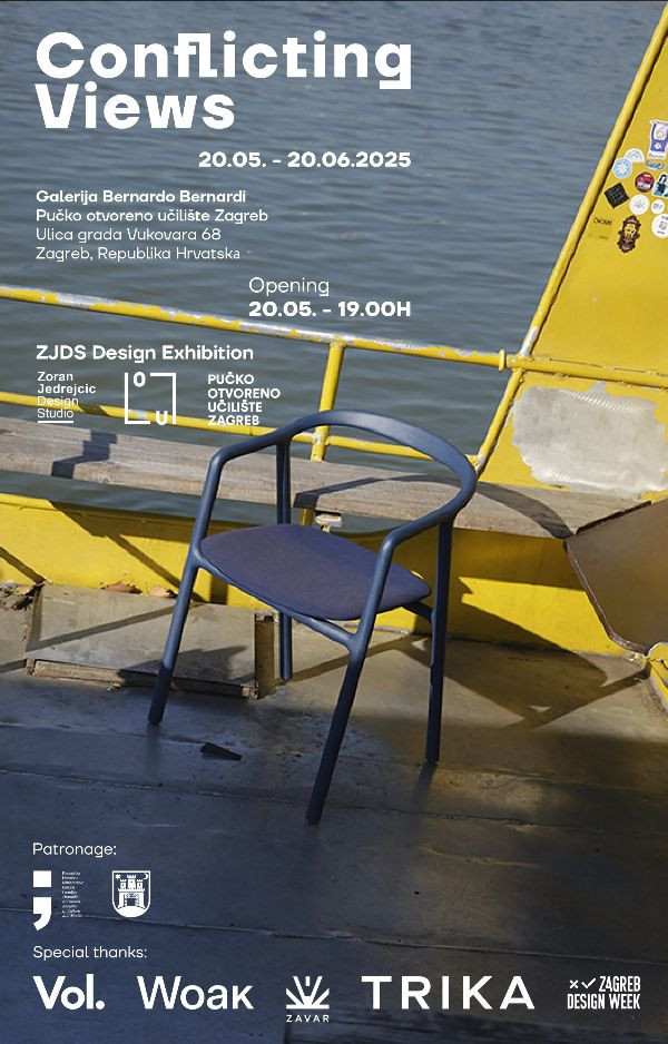 U Galeriji Bernardo Bernardi, Ulica grada Vukovara 68, Zagreb, u utorak, 20. svibnja u 19 sati otvara se izložba “Conflicting Views” Zorana Jedrejčića, hrvatskog dizajnera međunarodnog ugleda.