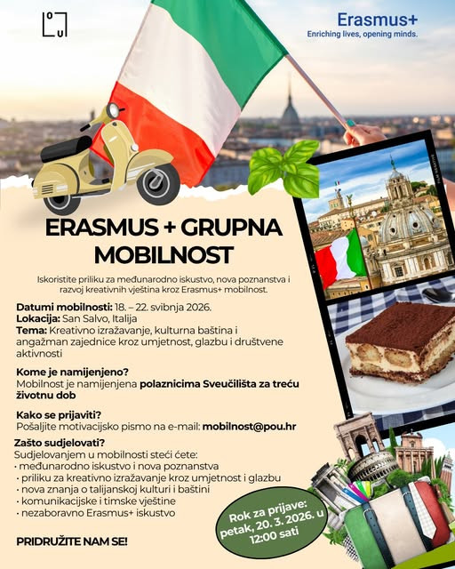Pozivamo sve polaznike Sveučilišta za treću životnu dob da se prijave na Erasmus+ grupnu mobilnost i postanu dio jedinstvenog međunarodnog iskustva!