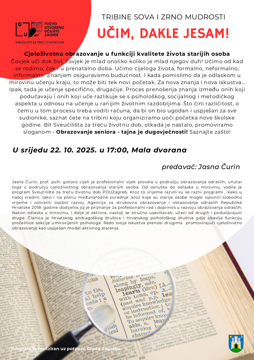 Pridružite nam se na prvoj tribini u ovom semestru iz ciklusa „Tribine Sova i Zrno mudrosti“ u srijedu, 22. listopada u 17:00 sati u Maloj dvorani (prizemlje).